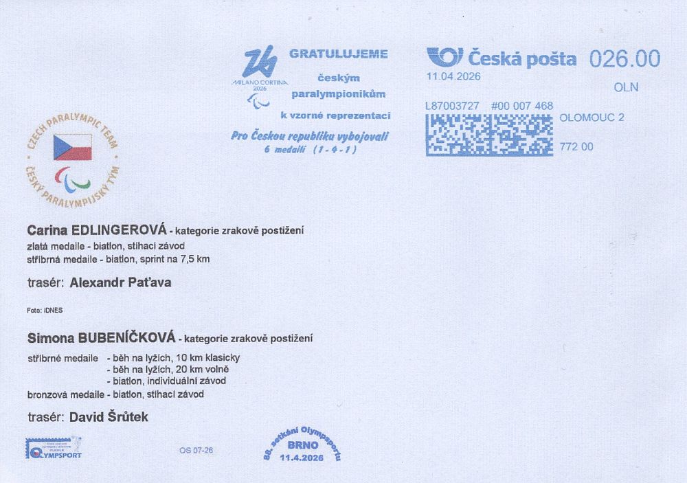 Na základě informace předsedy spolku Olympsport ČR Ing. Josefa Kočího můžeme informovat sběratelskou veřejnost, že Olympsport používal dne 11.4.2026 nový příležitostný motiv (digitální štoček) vedle digitální známky v modrých tiscích svého elektronického výplatního stroje Quadient (s licenčním číslem L87003727).