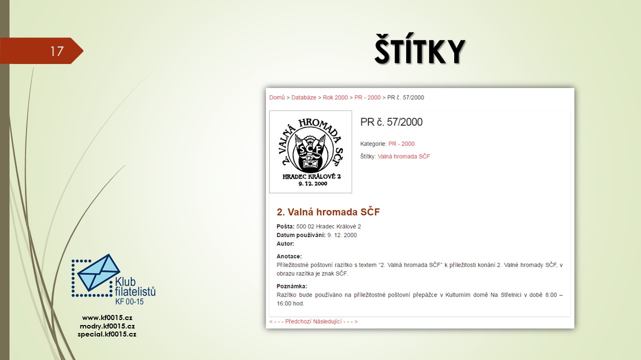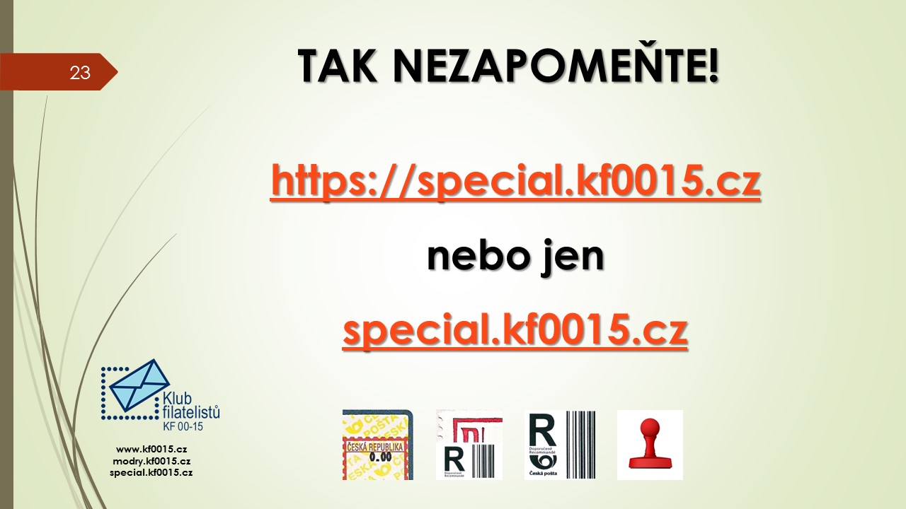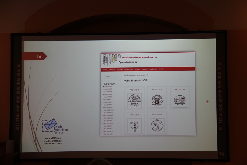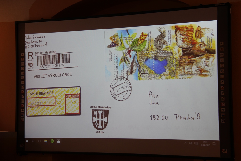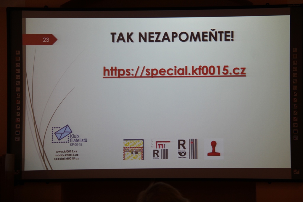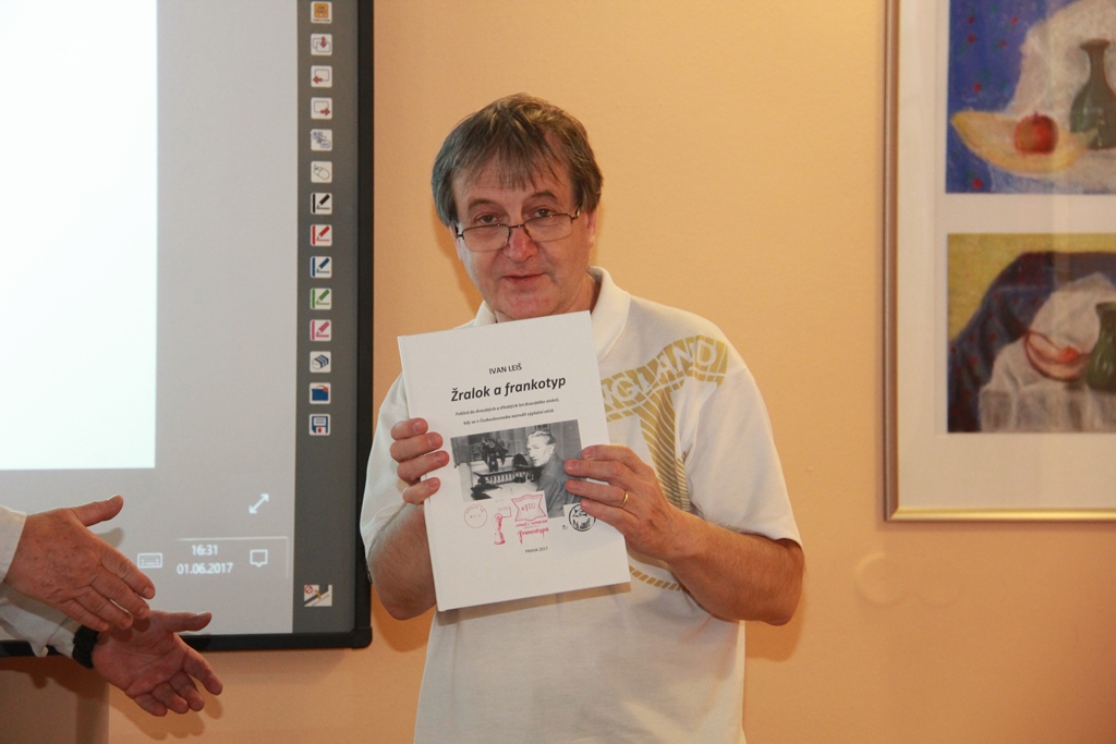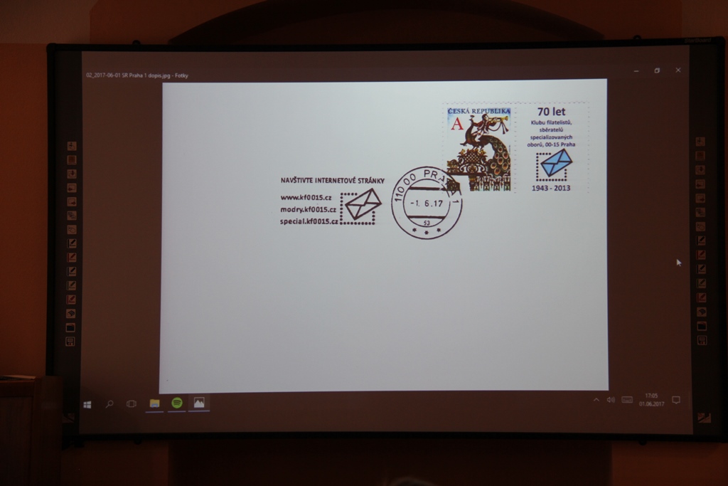 Ve čtvrtek 1.6.2017 se konalo poslední klubové odpoledne přednáškového cyklu 2016-2017. Bylo rozděleno na několik částí. V úvodu předseda klubu Ivan Leiš poděkoval Pravoslavu Kukačkovi k dlouholeté činnosti ve funkci jednatele klubu a předal mu na památku knihu „Žralok a frankotyp“ o Albertu Jonášovi, jejímž je autorem. Následovala přednáška Jiřího Marko, který představil nové specializované webové stránky. Ukázky z jeho promítané prezentace najdete v záložce „Ukázky webu“. Poté proběhla přednáška pánů Kukačky a Všetečky na téma „Současná příl. razítka a nálepky-jakou kvalitu požadujeme od České pošty“. Po jejím skončení se uskutečnila členská schůze klubu.