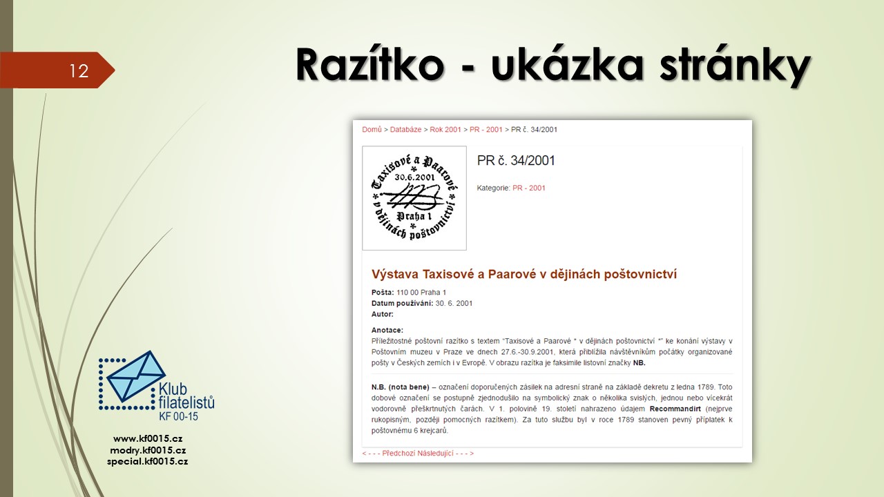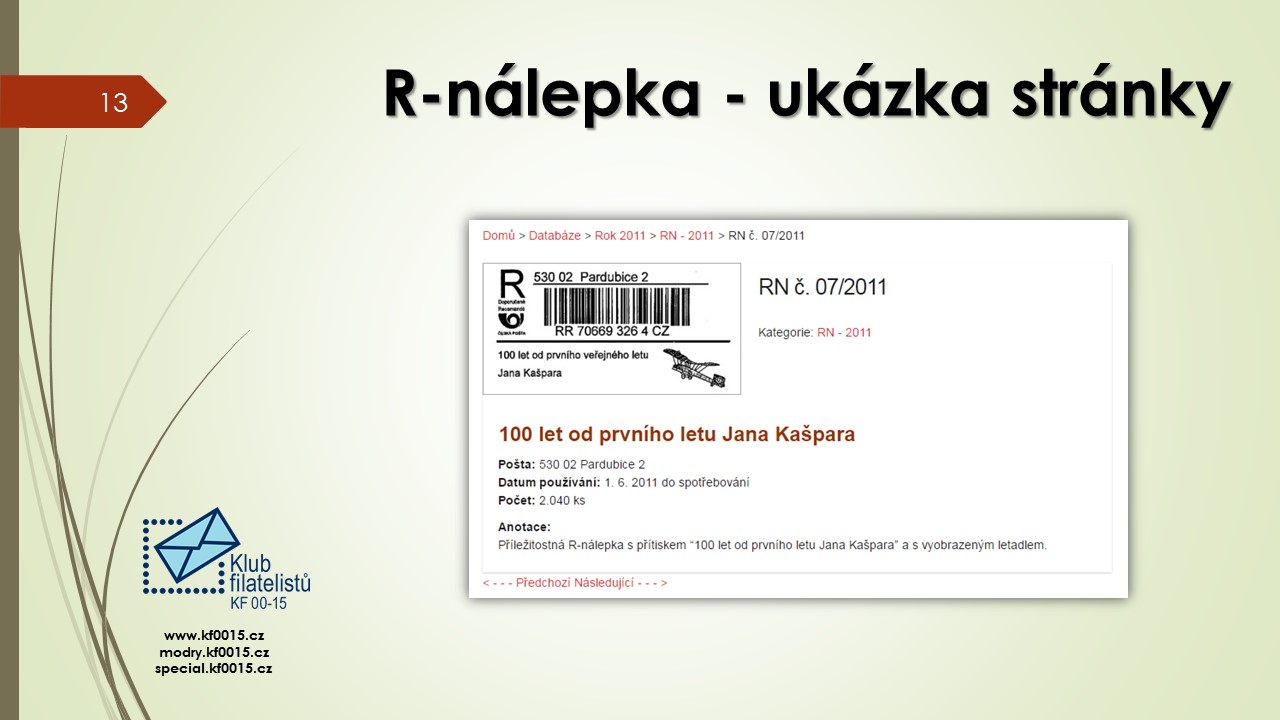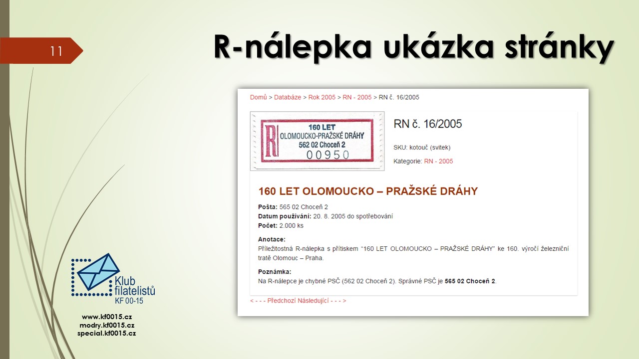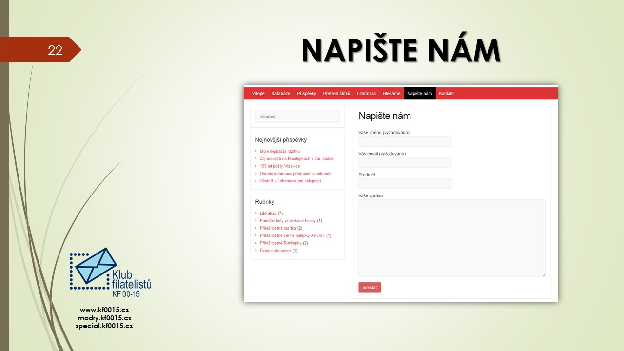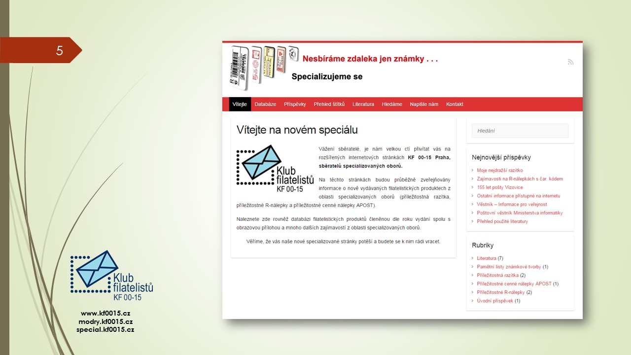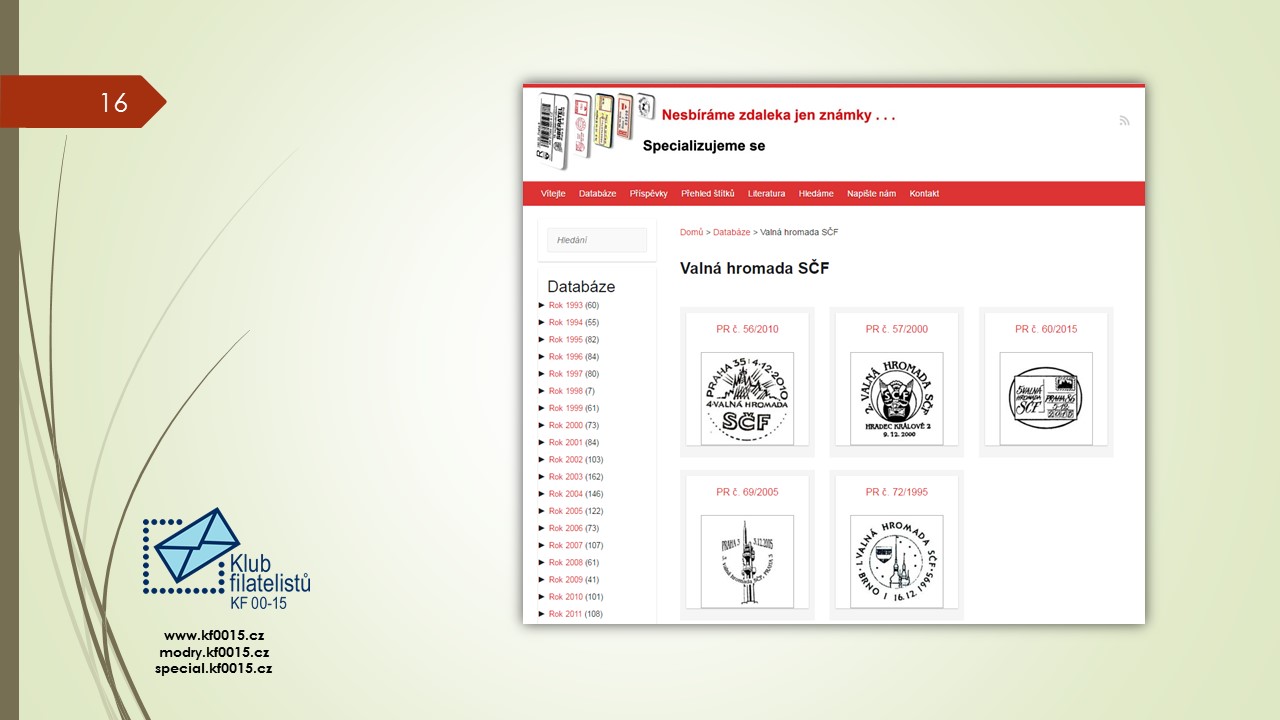 Ve čtvrtek 1.6.2017 se konalo poslední klubové odpoledne přednáškového cyklu 2016-2017. Bylo rozděleno na několik částí. V úvodu předseda klubu Ivan Leiš poděkoval Pravoslavu Kukačkovi k dlouholeté činnosti ve funkci jednatele klubu a předal mu na památku knihu „Žralok a frankotyp“ o Albertu Jonášovi, jejímž je autorem. Následovala přednáška Jiřího Marko, který představil nové specializované webové stránky. Ukázky z jeho promítané prezentace najdete v záložce „Ukázky webu“. Poté proběhla přednáška pánů Kukačky a Všetečky na téma „Současná příl. razítka a nálepky-jakou kvalitu požadujeme od České pošty“. Po jejím skončení se uskutečnila členská schůze klubu.